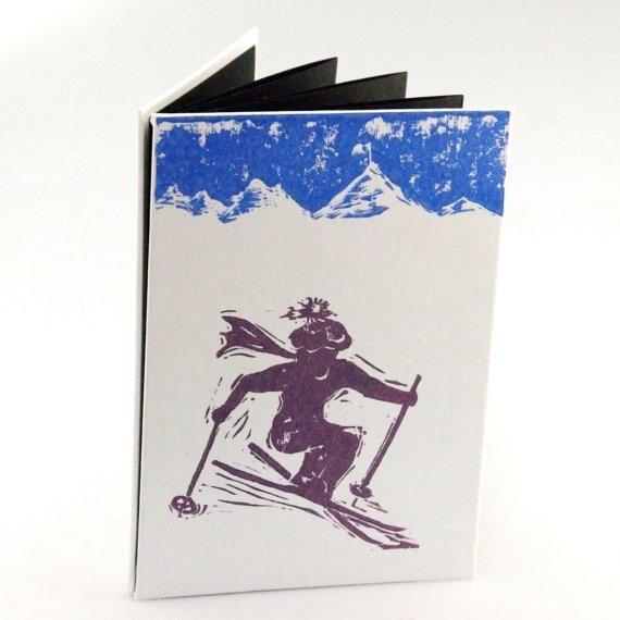 Exklusiv von Hand bedruckt mit einem handgeschnitzen Linoldruck: Ein Schifahrer, der in rasantem Tempo die Berge runter düst.