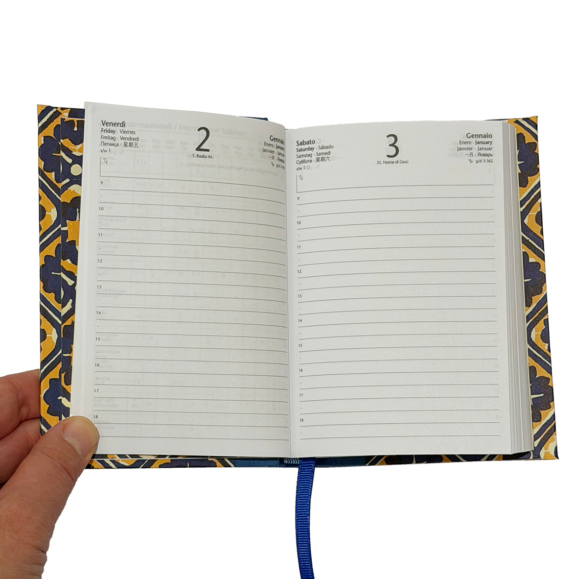 Der Tageskalender hat eine Jahres- und eine Monatsübersicht und verfügt über einen mit Alphabet versehenen Adressteil