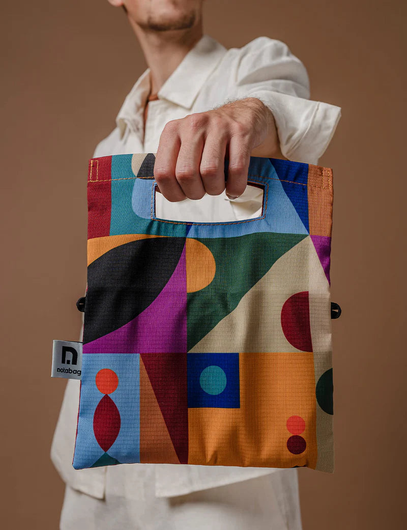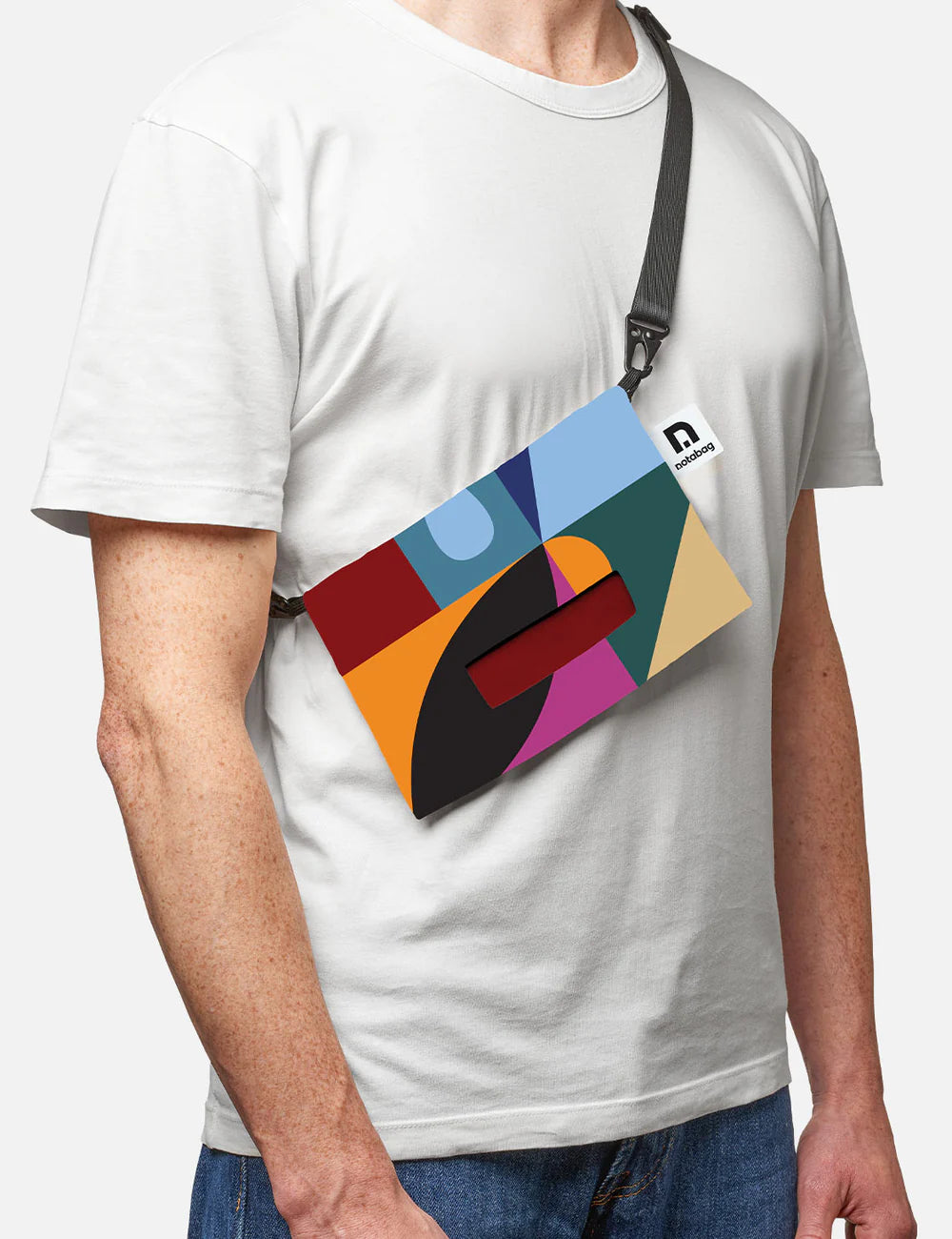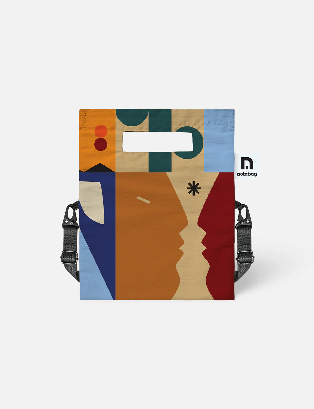 Entdecke die Crossbody Light – die kompakte Version unserer preisgekrönten Crossbody, jetzt im ausdrucksstarken Roots-Design. Abstrakte Gesichtsprofile, Kreise und geometrische Flächen in Dunkelrot, Orange, Beige, Blau und Teal erzählen von Ursprung und Verbindung.