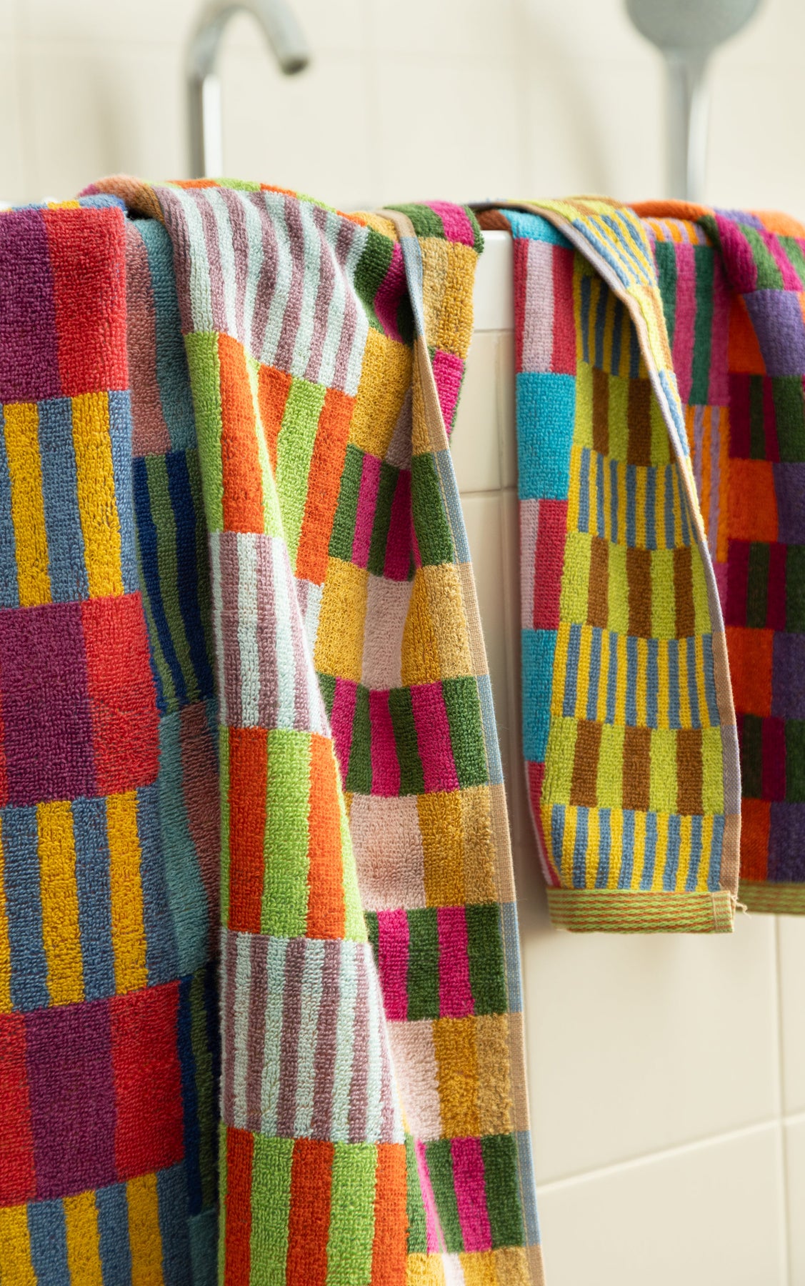 Farbenfrohe Heimtextilien aus Restmaterialien! Die Gästetücher Tulip Quilt von Odds & Ends verwandeln überschüssige Garnreste aus der Textilproduktion in lebendige, unerwartete Farbkombinationen. Hochwertig, weich und saugfähig – perfekt für Bad, Gäste oder Küche.