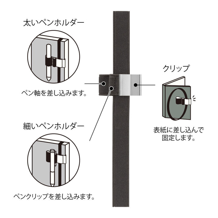 Das Gummiband wird längs über das Notizbuch gezogen. Die Stiftschlaufe ist flexibel und passt für Schreibwerkzeuge von dünn bis dick.