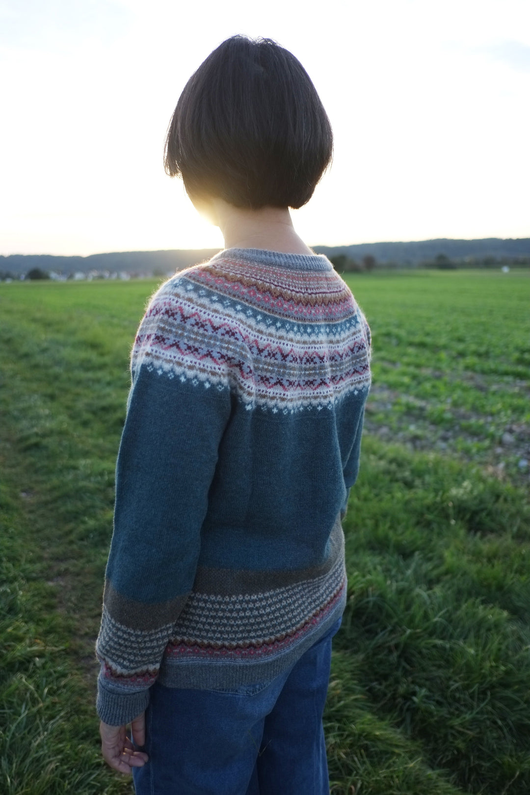 Wunderschöner Wollpullover mit bunter Passe aus dem schottischen Strickstudio Éribe.