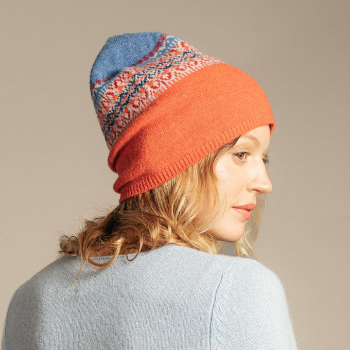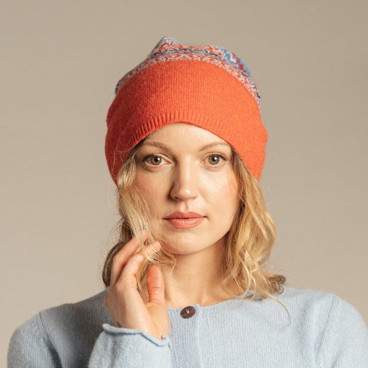 Wunderschön gemusterte Beanie aus weicher Lammwolle. Design und Herstellung:  Strick-Desigstudio Éribe in Schottland.