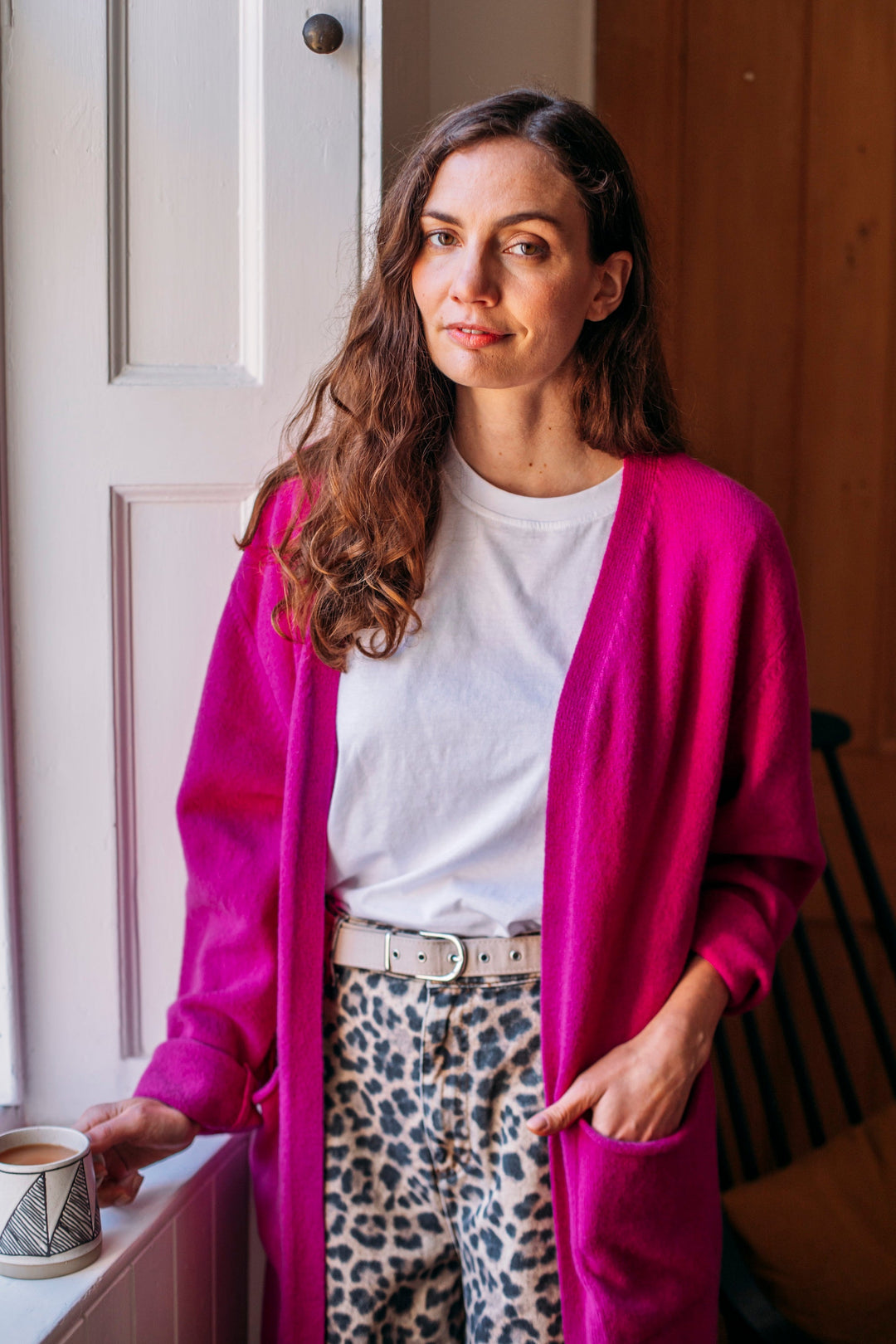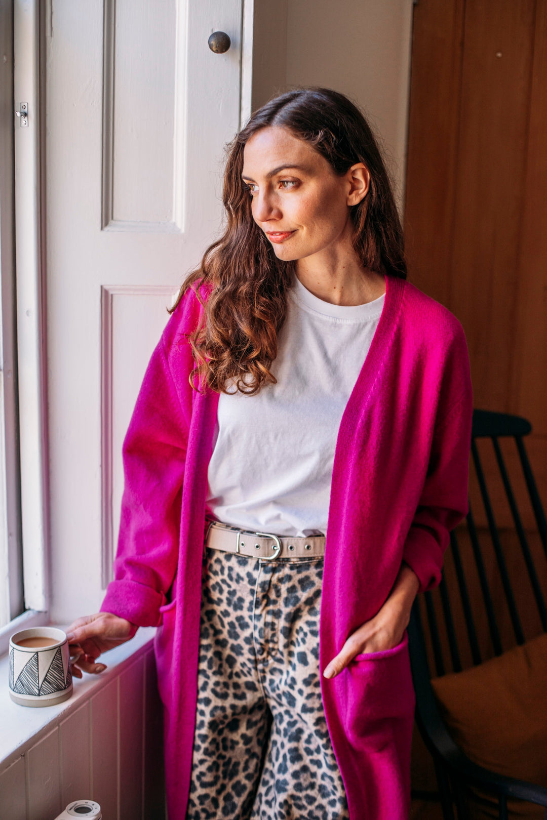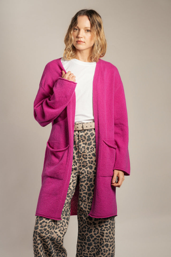 Corry Long Cardigan Honesty – Damen-Strickmantel aus 100 % mulesingfreier Merinowolle in kräftigem Pink
