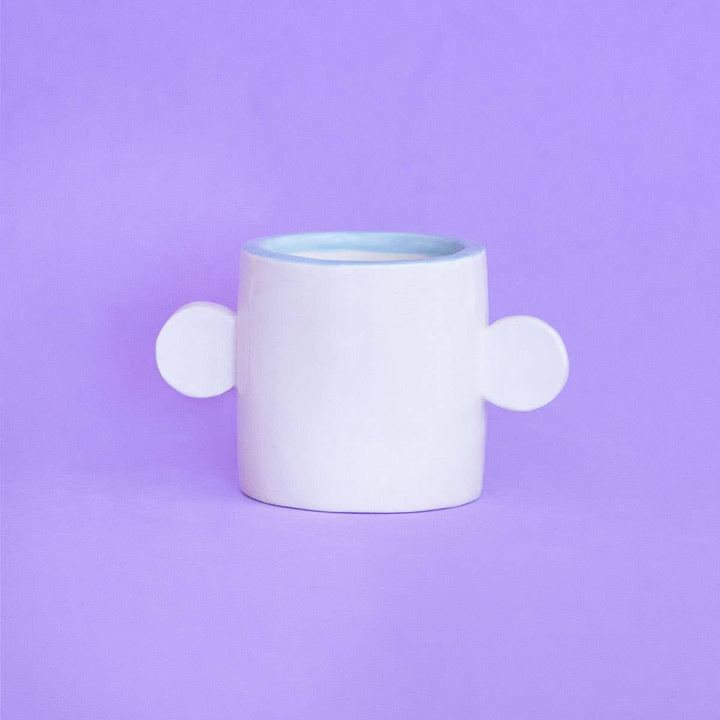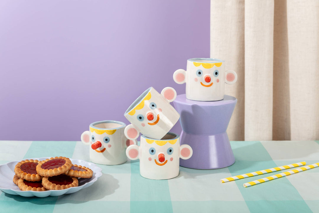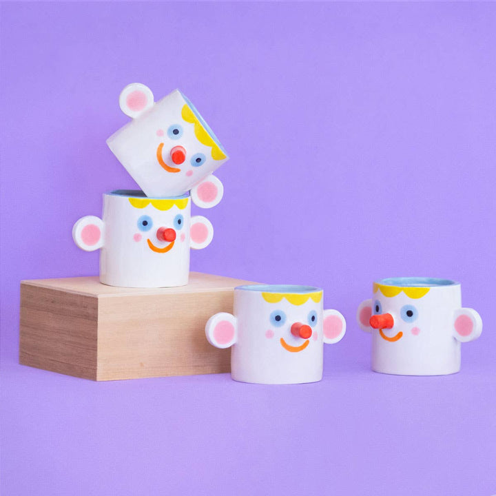 Ein handgetöpferter und handbemalter Stiftebecher mit freundlichem Gesicht, abstehenden Ohren, langer roter Nase und gelben Haaren aus der Werkstatt der portugiesischen Künstlerin Ana Seixas.