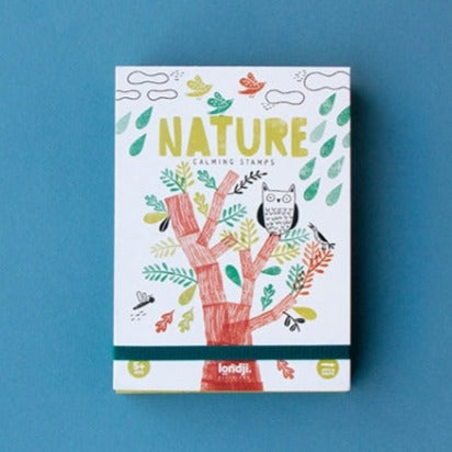 - 6 Holzstempel mit den Motiven: Baumstamm, Blätter, Regentropfen und Vogel