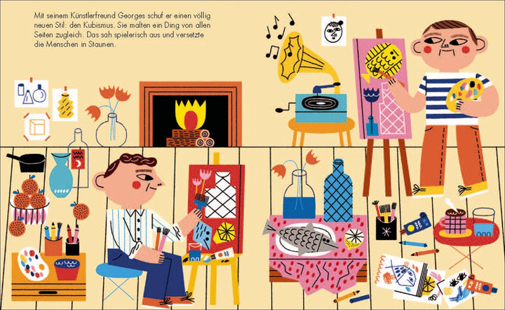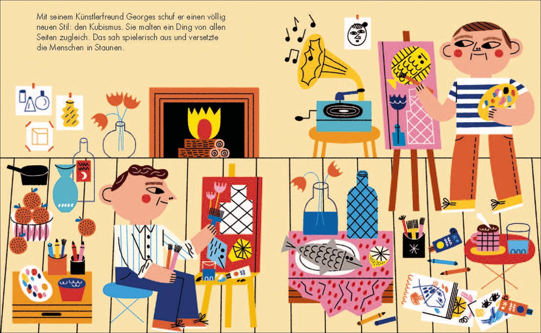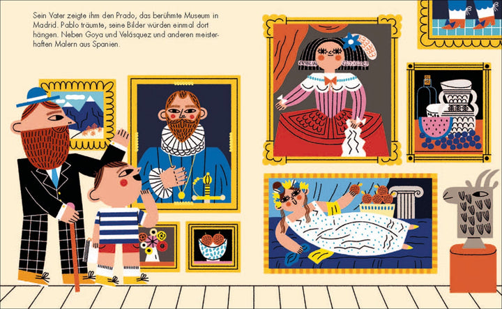 "Das erste Wort, das der kleine Pablo sprach, war angeblich nicht »Mama«, sondern »piz«, die Abkürzung für »lápiz«, der Malstift.  Sein Vater brachte ihm Malen und Zeichnen bei, und schon als Zehnjähriger wurde er an einer Kunstschule aufgenommen. Im Lauf seines Lebens hat sich seine Kunst und sein Stil immer wieder verändert, von der »Blauen Periode« bis zur »surrealistischen Phase«. Der Maler und Bildhauer wurde zum einflussreichsten Künstler des 20. Jahrhunderts."