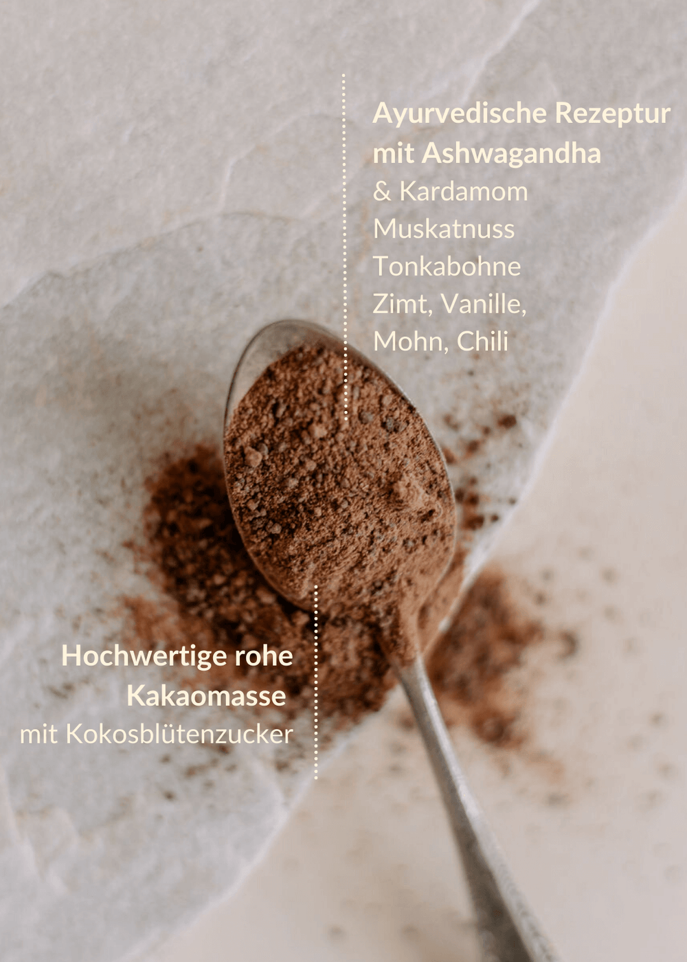 ZUTATEN: Rohkakaomasse, Kokosblütenzucker, Ashwagandha (Withonia somnifera) 3,9 %, Mohn, Chili, Salz, Tonkabohne, Ceylon-Zimt, Kardamom, Muskatnuss, Vanille