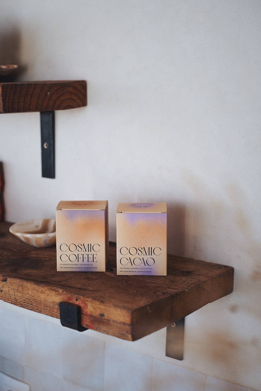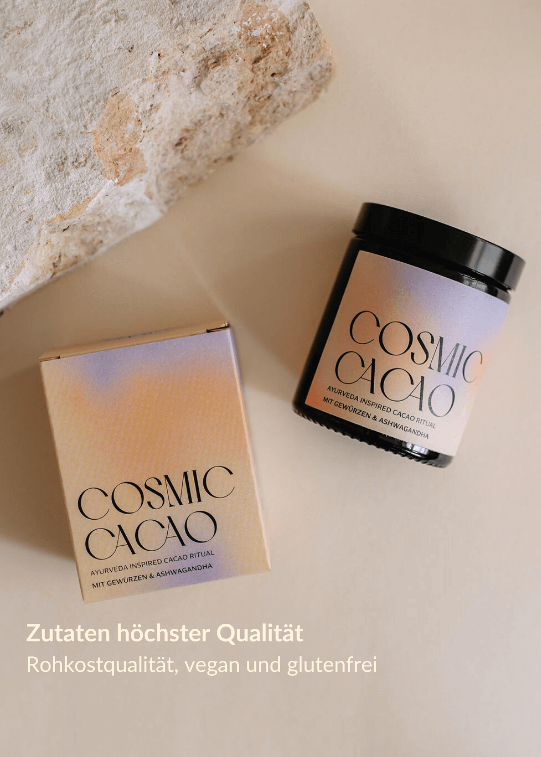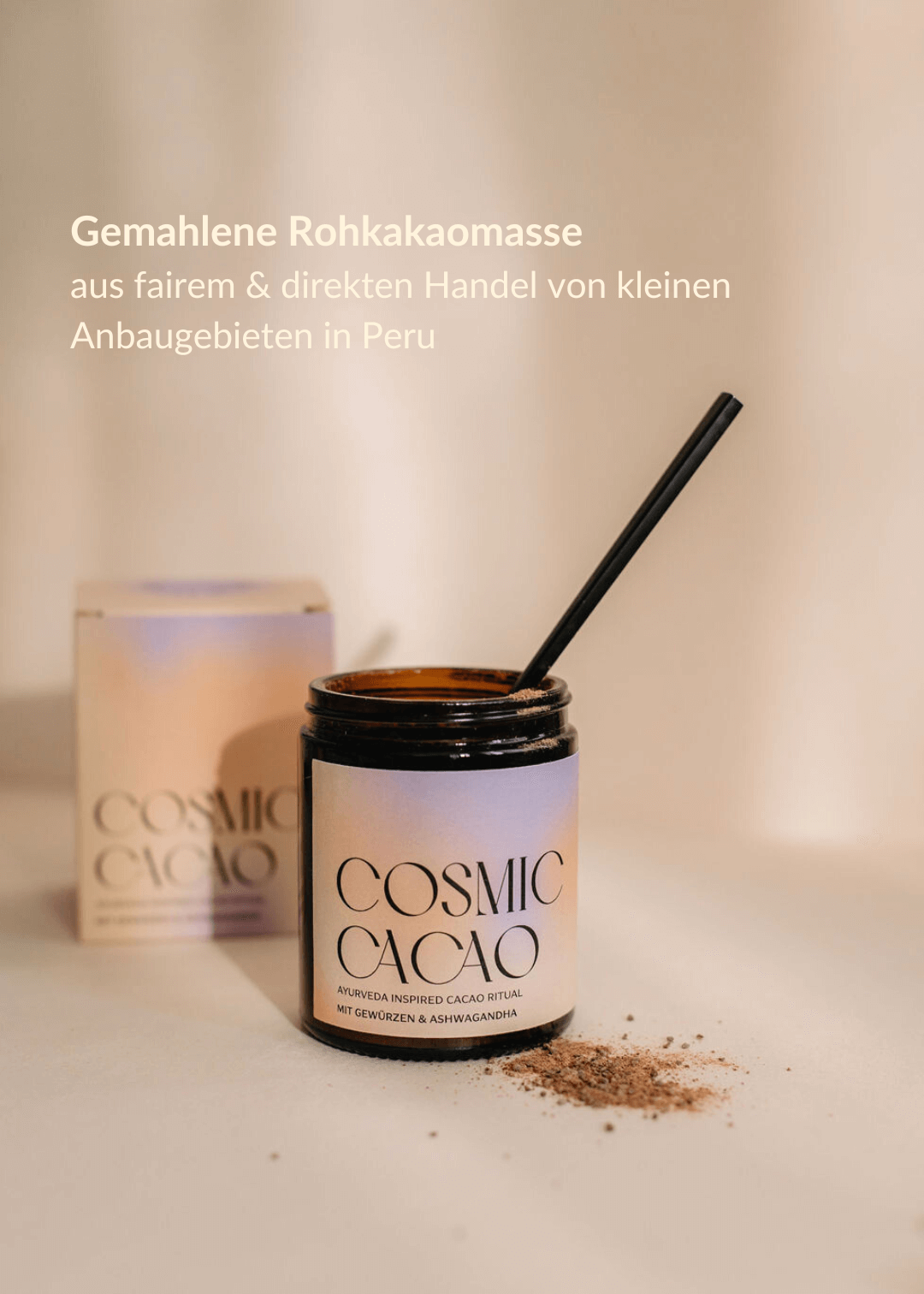 Cosmic Cacao – eine ayurvedische Mischung aus 8 wohltuenden Gewürzen und der entspannenden Ashwagandha Beere.