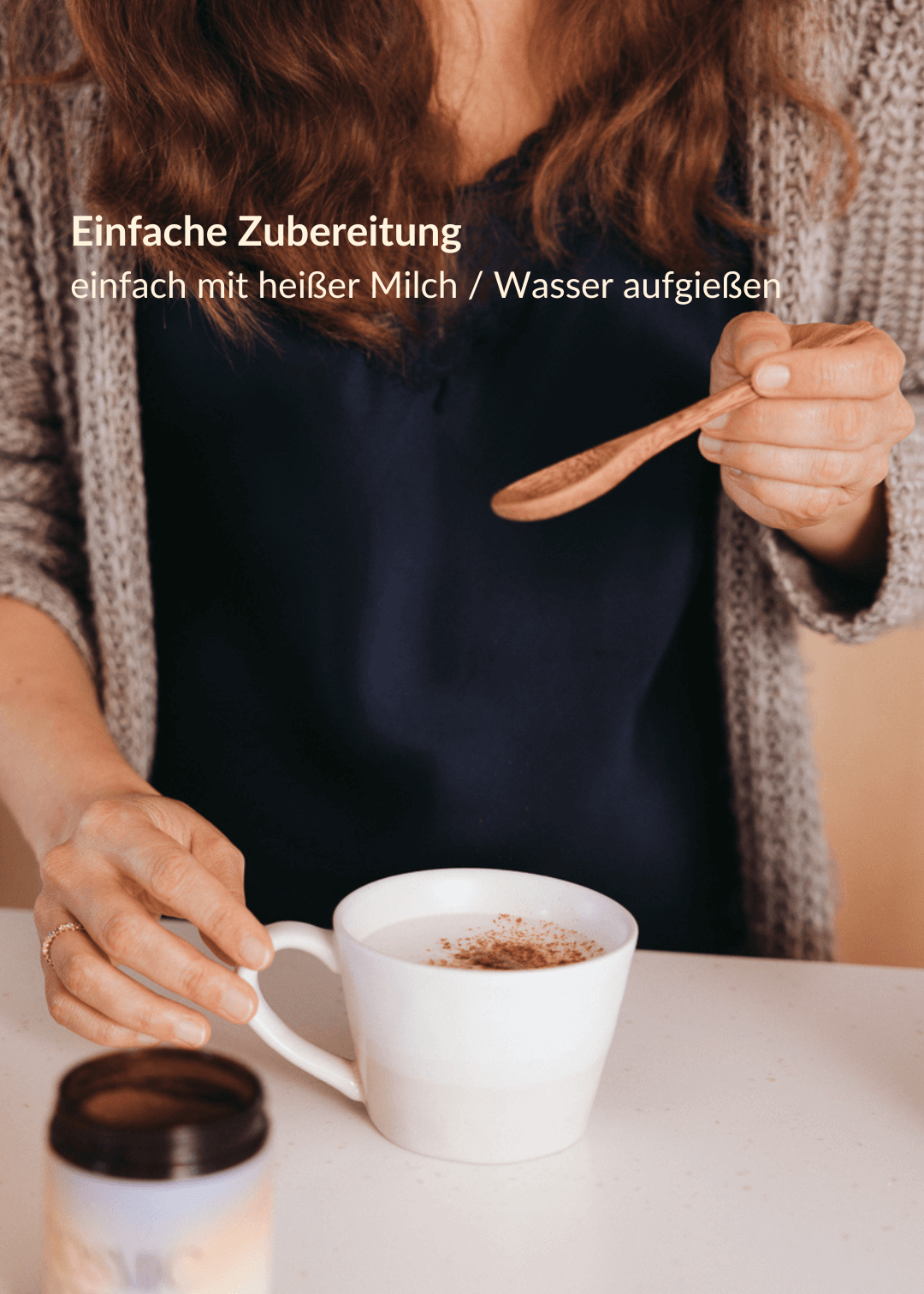 Zubereitung: 1 Teelöffel Pulver mit heißem Wasser oder Milch aufgießen, umrühren und genießen. Eine Packung reicht für ca. 20 Portionen.