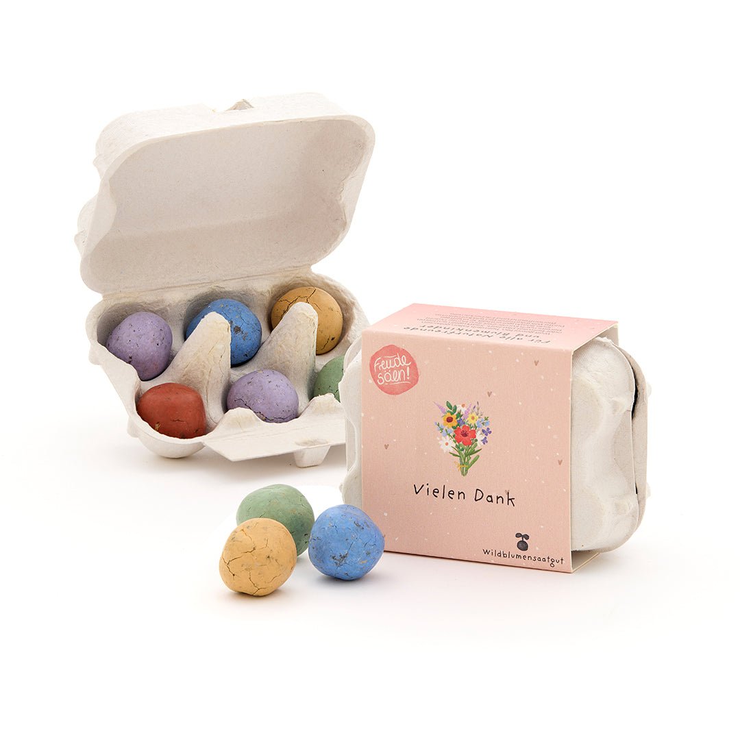Ein Dankeschön, das wächst und blüht – diese 6 bunten Blumenmurmeln im nostalgischen Mini-Eierkarton sind das perfekte Geschenk, um jemandem von Herzen Danke zu sagen. Mit dem schlichten Spruch „Vielen Dank" verschenkst du nicht nur Worte, sondern auch einen bunten Blumengruß zum Selberzüchten.